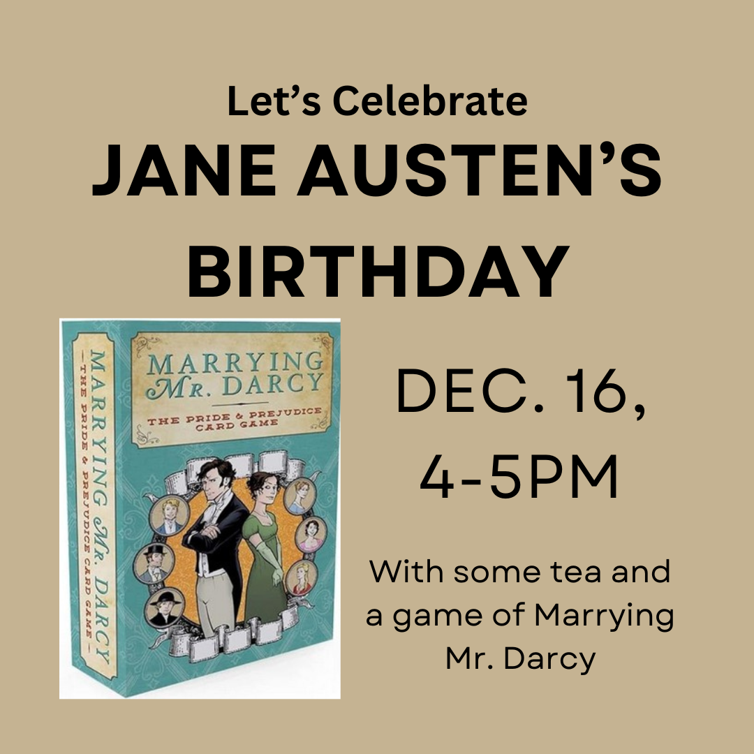 Monday, Dec. 16, 4-5pm. Let’s Celebrate Jane Austen’s Birthday with some tea and a game or two of Marrying Mr. Darcy. I need to make it to Hudson by 6pmContinue reading “Jane Austen’s Birthday”