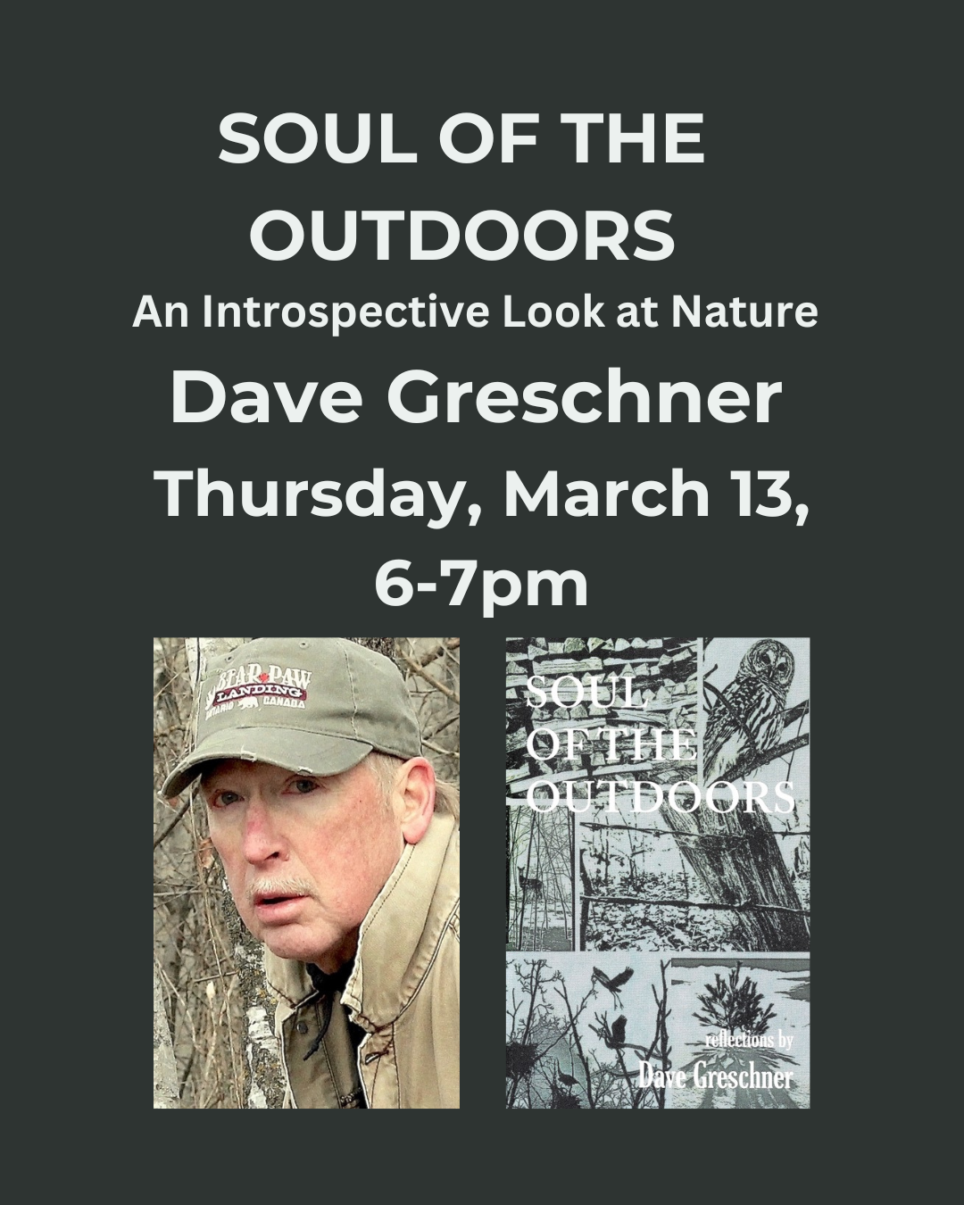 Thursday, March 13, 6-7pm. Dave Greschner, award winning outdoor writer and columnist, will share an introspective look at nature. The Book: It takes years to learn the art of seeing, ofContinue reading “Soul of the Outdoors: An Introspective Look at Nature”